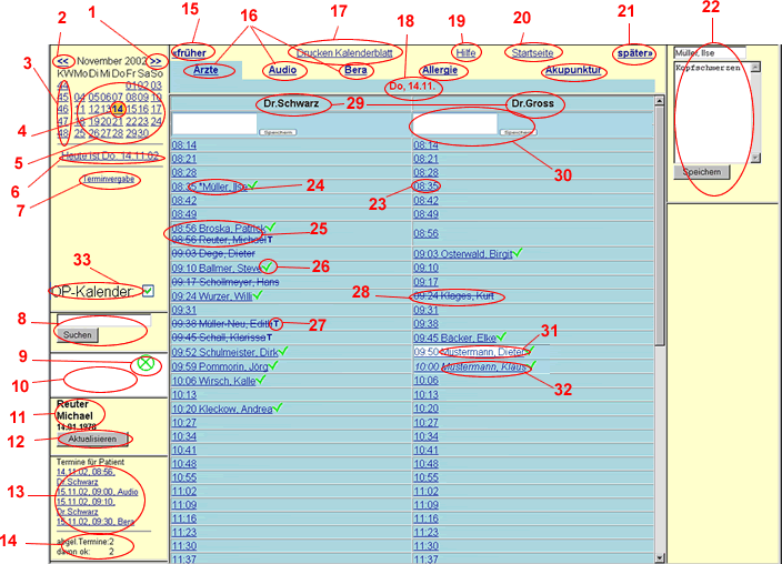 | 16 | Titel weiterer Kalenderblätter. Durch Klick auf diesen Titel wird das jeweilige Kalenderblatt angezeigt für den aktuell angezeigten Zeitraum. Gehören zu einem Kalenderblatt mehrere Terminbücher, steht jedes Terminbuch in einer eigenen Spalte. Im Beispiel oben werden die Terminbücher "Dr.Schwarz" und "Dr. Gross" gemeinsam auf dem Kalenderblatt "Ärzte" dargestellt. |